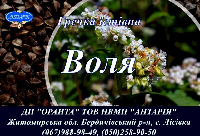 Воля За результатами державного сортовипробування сорт внесено до Реєстру сортів рослин України з 2015 року. Сорт Воля виведений в ТОВ НВМП «Антарія» шляхом об’єднання шести компонентів, які є індивідуальними доборами за ознаками озерненості суцвіть, індексу індивідуальної насіннєвої продуктивності та індексу атракції, із популяцій гречки, вирівняних за вегетаційним періодом та крупністю зерна. Ботанічний таксон (вид) - Fagopyrom esculentum Moench Різновидність – алята. Характеристики: Рослини прямостоячі, висотою 110 см, маса 1000 зерен – 29-31г. Сорт середньостиглий, тривалість вегетаційного періоду 82-84 дні. Форма стебла компактна, Гілки розміщені під прямим кутом. Суцвіття виповнені. Аноціанове забарвлення суцвіть відсутнє. Квітка: колір оцвітини та пелюсток білий. Сортстійкий до осипання та вилягання. Не відмічено ураження хворобами та шкідниками. Технологічні та харчові якості високі. Належить до цінних сортів (вирівняність зерна – 85-88%, плівчастість – 22%, вихід крупи – 77%, вміст білку – 14,8%). Урожайність: Середня врожайність за результатами державного та виробничого випробування 3,0т/га (5,6ц/га до стандарту). Максимальна врожайність 4,9т/га. Зона районування: Полісся, Лісостеп, Степ України. Переваги сорту: Висока врожайність, стійкість до полягання, шкідників та хвороб. Особливості технології вирощування: • Технологія вирощування – загальноприйнята; • Строк сівби – кінець квітня – початок травня місяця, як пожнивна культура - кінець червня початок липня місяця. • Норма висіву: при широкорядному способі сівби 2,0-2,5 млн. шт./га, при звичайному – 3,0-3,5 млн. шт./га.
