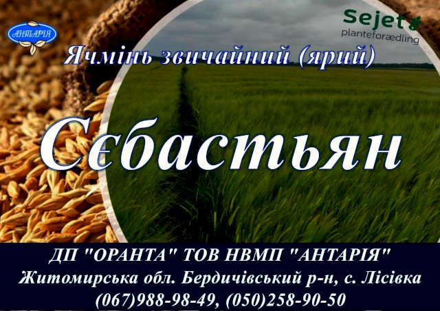 Ячмінь звичайний (ярий) СЄБАСТЬЯН Оригінатор – «Сейет Плантефоредлінг І/С», Данія В Реєстрі сортів рослин України 3 2008 року. Виведений методом схрещування. Різновидність – нутанс. Форма куща – прямостояча. Колос – дворядний, середньої щільності, солом’яно-жовтий. Зернівка – еліптична, виповнена, жовта, велика. Маса 1000 насінин досягає 46,2 г. Сорт – напівпізній. Стебло – низькоросле, висотою – 65-70 см. міцне, стійкість до вилягання висока Характеризується хорошим кущенням. За даними заявника, рекомендується висівати за 100- відсоткової господарської придатності – 3,5-4,5 млн./га насінин. Сорт інтенсивного типу. Добре реагує на внесення повного мінерального живлення. Для досягнення найвищої якості солоду рекомендується висівати після коренеплодів. Якщо ж пивоварні характеристики не являються домінуючими, то можна висівати і після злакових. Пивоварні якості відмінні. Високий та стабільний врожай. Відзначається високою стійкістю до хвороб, але за сприятливих умов для розвитку хвороб потребує фунгіцидного захисту. Відноситься до найперспективніших сортів ячменю пивоварного напрямку з високою екстрактивністю – 83%, стабільним вмістом білку (10,7 – 11,5%) Рекомендований для вирощування у зонах Полісся, Лісостепу та Степу