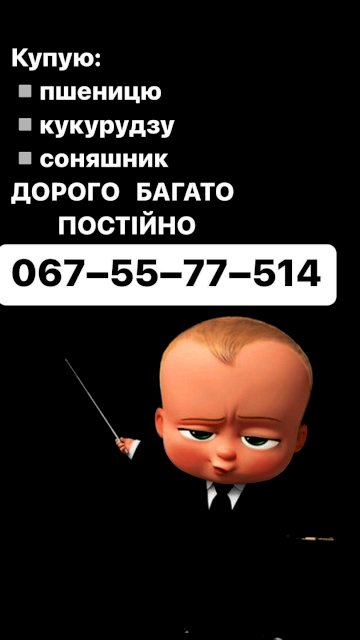 Якщо ти маєш зерно, то я купую його Сьогодні я шукаю і купую: - пшеницю 4 класс (фуражна) ЦІНА - 8 250 з НДС СPT порт Одеса Так само купую на елеваторі - кукурудзу ЦІНА - 8 400 з НДС СPT порт Одеса Так само купую на елеваторі - насіння соняшнику ЦІНА - 16 700 з НДС Приймаємо на ЗМЖК Запоріжжя Так само купую на елеваторі У мене найкращі ціни на ринку, зі мною зручно та легко, а головне – надовго Тому переставай думати Бери трубку – набирай номер! 067 - 55 - 77 - 514