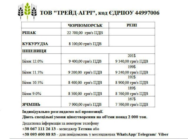 ДОБРОГО ТА МИРНОГО ДНЯ!!! ЗАКУПОВУЄМО по безготівковому розрахунку з ПДВ: 1. КУКУРУДЗУ - 8 100,00 грн. 2.ПШЕНИЦЮ ЧОРНОМОРСЬК: Білок 12.0% - 9 400,00 грн. Білок 11.5% - 9 200,00 грн. Білок 10.5% - 8 400,00 грн. Білок 9.0% - 8 300,00 грн. РЕНІ: Білок 12.0% -9 340,00 грн./ 201$ Білок 11.5% - 9 240,00 грн./ 199$ Білок 10.5% - 8 900,00 грн./ 192$ Білок 9.0% - 8 760,00 грн. / 189$ 3.ЯЧМІНЬ: ЧОРНОМОРСЬК - 7 900,00 грн. РЕНІ - 7 760,00/ 167$ 3. РІПАК ЧОРНОМОРСЬК - 22 700,00 грн. *Працюємо по всій Україні * Закупка з місця та самовивіз власним автотранспортом * Швидка оплата * Працюємо 24/7 * Діють спеціальні умови ціноутворення на об’єми від 2 000 тон Актуальні ціни та додаткова інформація за номером телефону 067 111 26 13 - менеджер ТЕТЯНА АБО 093 600 88 83 - для повідомлень у месенджерах WhatsApp / Telegram / Viber Ел. пошта: [email protected]