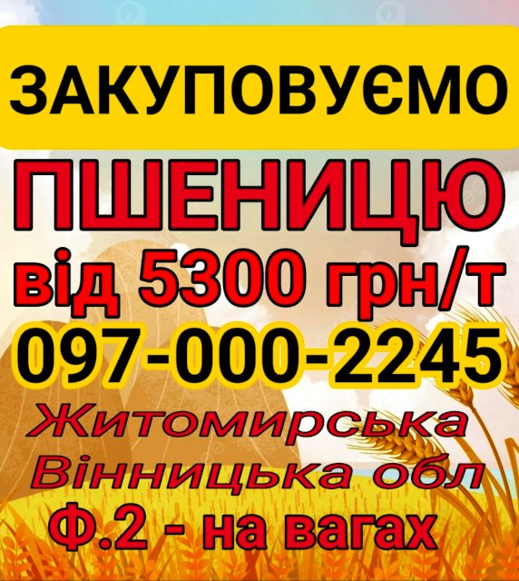 ЗАКУПОВУЄМО__ _Пшеницю 2 3 4 кл Житомирська, Вінницька, Київська, Черкаська обл. САМОВИВІЗ з поля, господарства,__від 25 тонн.__ Або з доставкою на склад в м. Андрушівка, Бердичівський район. __від 5 тонн.__ Розрахунок Ф2. ПРОПОНУЄМО НАЙКРАЩІ ЦІНИ. ___097-000-2245