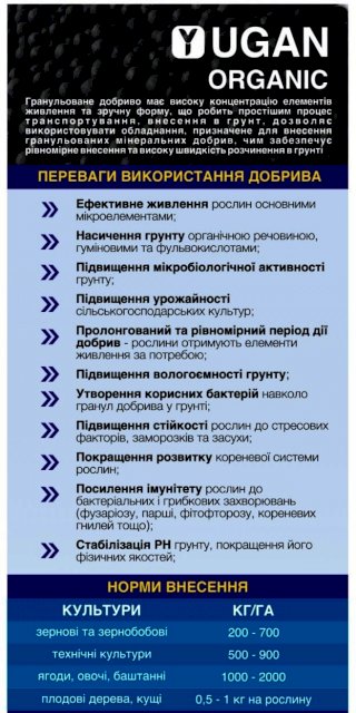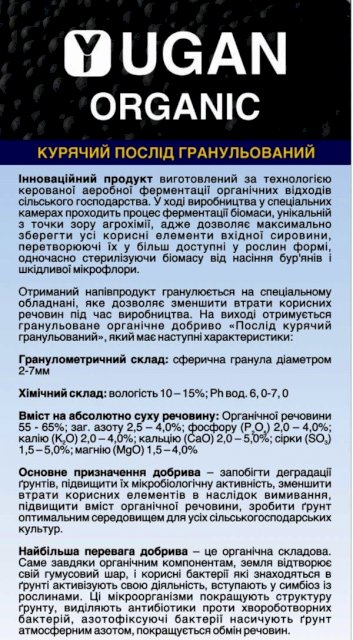 Доброго дня! Ми вітчизняний виробник добрив ТОВ Юган Трейдинг> Рівненська обл. Дубенський р-н. с.Козин. Також виробляємо МЕЛІОРАНТИ, МІНЕРАЛЬНІ,NPK добрива- на останньому фото! Ціна залежить від кількості ! Можлива різна Форма оплати ! Логіст допоможе з доставкою! Гранульований курячий послід +НПК - 7500 грн./т. Азот 4%,Фосфор 3%, Калій 3%,Кальцій 3%, Сірка 4%,Магній 0,5%. Органічна речовина - 50%. Вологість до 20%. Гранула кругла діаметром 2-4 мм, 5-7мм. Фасовка- біг-бег- 1т., мішки 50 кг. та ін. Можна вносити звичайним розкидачем добрив (лійка) а також сівалкою. Органічне добриво, яке швидко і легко засвоюється рослинами та підвищує врожайність грунту. З усіх видів органічних добрив гранульований курячий послід як добриво вважається найбільш цінним. У його складі доступний азот, фосфор, калій, а також кальцій, що сприяє розкисленню грунтів. Переваги і норми внесення гранульованих добрив з курячого посліду в грунт: Підживлення дерев, зернових, овочевих, і технічних культур курячим послідом має дуже різні норми внесення – від 200 до 2000 кг/га. Забезпечує збалансоване живлення всіх сільськогосподарських рослин, плодових дерев, кущів, розсади, в результаті отримуємо екологічно чисту продукцію. Збільшення врожайності на 20 - 35%, покращується якість врожаю. Пришвидшує дозрівання врожаю на 10 – 15 днів. Збільшує вміст сухої речовини в сг культурах. Покращує склад і властивості грунтів: відновлює гумусний шар, насичує грунт гуміновими та фульвокислотами, збалансовує кислотність, забезпечує посилений ріст корисної мікрофлори, підвищує родючість грунту на тривалий термін (до 3 років). Посилює стійкість рослин до несприятливих умов середовища і захворювань.