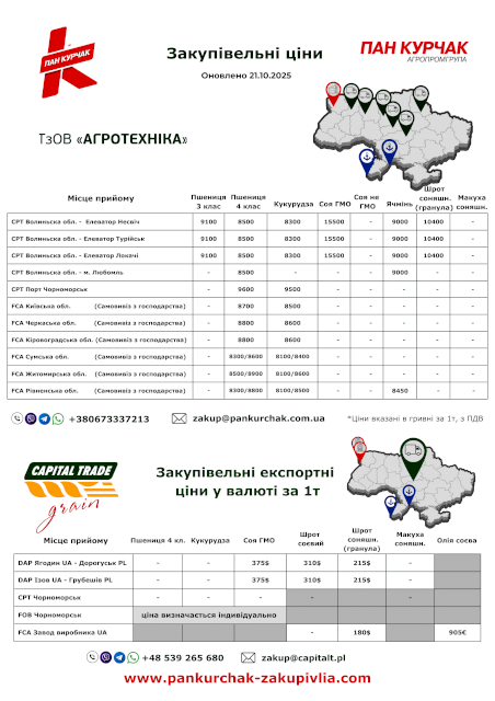 Ціни дивіться у зображеннях до оголошення! Закуповуємо: - кукуруза, - пшениця 3 клас / 4 клас, - соя ГМО/ не ГМО, - шрот соєвий, - ячмінь, - макуха соняшникова. - шрот соняшниковий, - олія соєва Зв'язатися з менеджером з постачання: В гривні з ПДВ (ТзОВ «Агротехніка»): +380673337213 - Олександр [email protected] У валюті (Capital Trade): +48539265680 [email protected] Наш сайт: pankurchak-zakupivlia.com