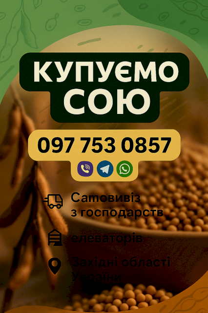 Закуповуємо сою . Самовивіз з господарства, елеваторів. Від 25-50 т