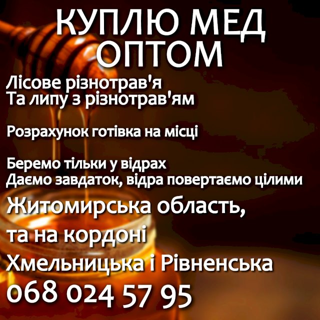 КУПУЄМО МЕД ОПТОМ Мед Липа з різнотрав'ям Мед Лісове різнотрав'я Житомирщина, та на кордоні Хмельницька і Рівненська області. Розрахунок готівка на місці. Беремо тільки у відрах. Даємо завдаток, відра повертаємо цілими. Пишіть у вайбер або телефонуйте 068 024 57 95