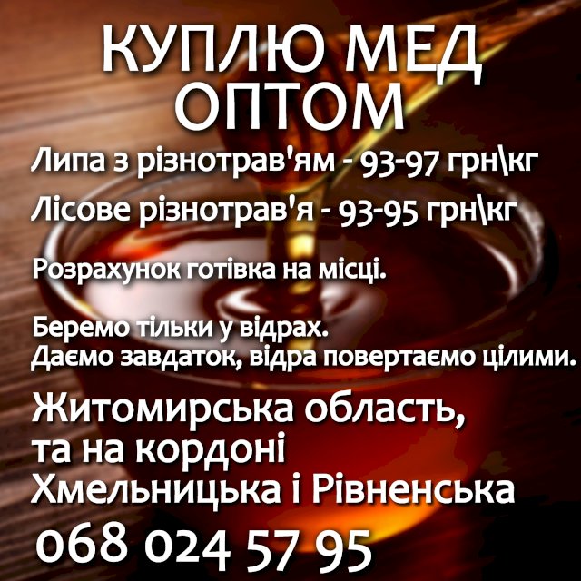 КУПУЄМО МЕД ОПТОМ Мед Липа з різнотрав'ям - 93-97 грн\кг Мед Лісове різнотрав'я - 93-95 грн\кг Житомирщина, та на кордоні Хмельницька і Рівненська області. Розрахунок готівка на місці. Беремо тільки у відрах. Даємо завдаток, відра повертаємо цілими. Пишіть у вайбер або телефонуйте 068 024 57 95