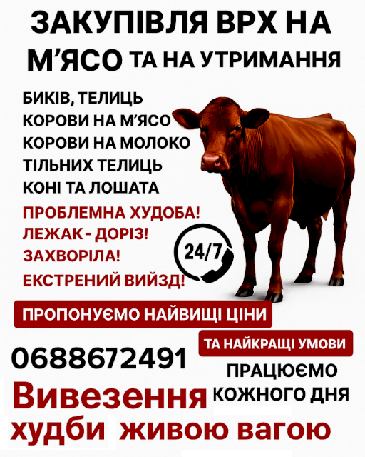 Закупівля ВРХ на м’ясо та на утримання Купуємо: * биків, телиць * корів на м’ясо * корів на молоко * тільних телиць * коней та лошат Також беремо проблемну худобу: лежаків, доріз, хворих. Можливий екстрений виїзд 24/7! Пропонуємо найвищі ціни. Найкращі умови. Працюємо щодня. Вивезення худоби живою вагою. Телефонуйте 0688672491