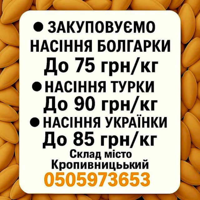 Компанія запрошує до співпраці фермерські господарства та виробників, які реалізують насіння гарбуза високої якості. Ми здійснюємо закупівлю різних сортів за конкурентними цінами: Болгарка — до 75 грн/кг, Турка — до 90 грн/кг, Українка — до 85 грн/кг. Приймаємо насіння здійснюється на складі в місті Кропивницький. Можлива робота з ПДВ і без ПДВ, залежно від статусу постачальника. Ми гарантуємо: стабільну оплату без затримок; чесне зважування та прозорі розрахунки; тривале партнерство на взаємовигідних умовах; оперативну логістику та зручні умови. З питань співпраці телефонуйте. +380505973653
