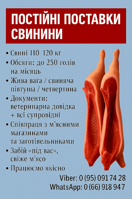 • Свині 110-120 кг • Обсяги: до 250 голів на місяць • Жива вага / свиняча півтуша / четвертина • Документи: ветеринарна довідка + всі супровідні • Співпраця з м?ясними магазинами та заготівельниками • Забій «під вас», свіже м?ясо • Працюємо якісно Viber: о(95) о91 74 28 WhatsApp: о(66) 918 947